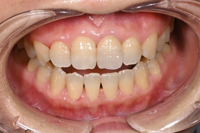 | 治療方法 | ジルコニアセラミッククラウンによる審美治療+ホワイトニングによる審美治療 (下の歯のホワイトニング後の色味よりもワンランク明るく作成) |