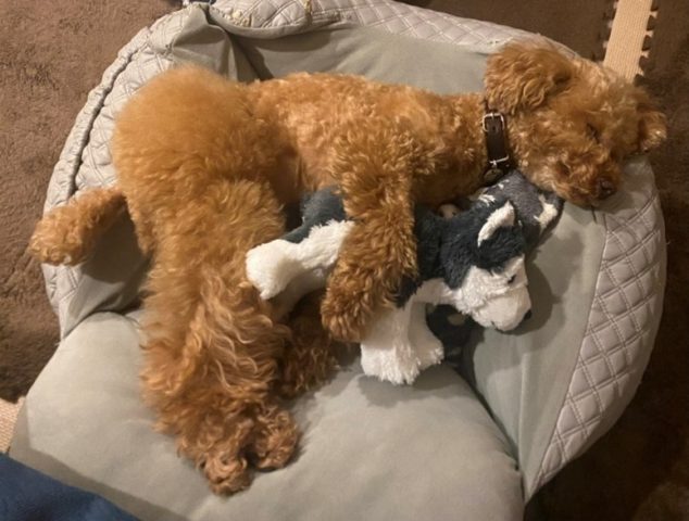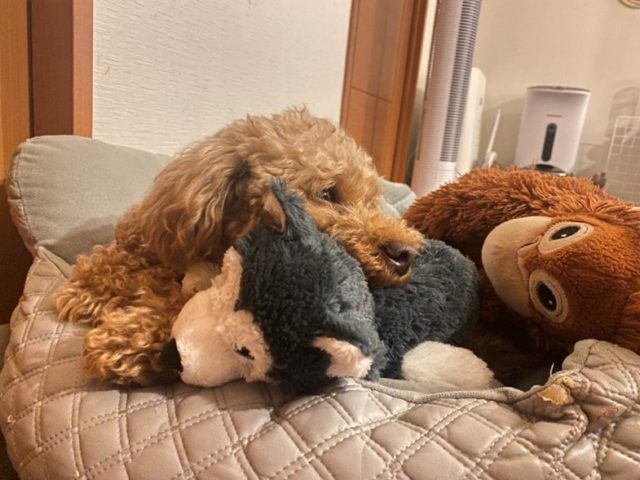 我が家のトイプードル、パセリ(6才)もエアコンの下で