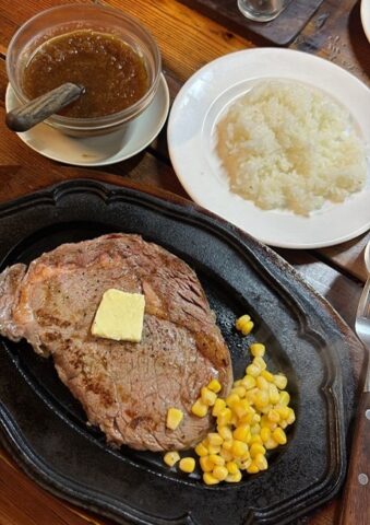 プロレスラーの方々も通うという人気のステーキ店「リベラ」というお店に行きました。30分ほど並んでようやくいただけました。